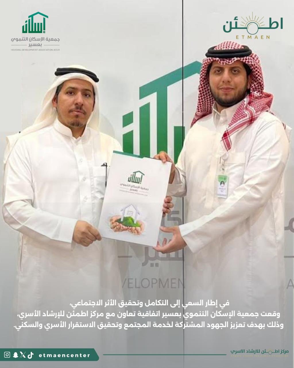 وقعت جمعية الإسكان التنموي بعسير اتفاقية تعاون مع مركز اطمئن للإرشاد الأسري، وذلك بهدف تعزيز الجهود المشتركة لخدمة المجتمع وتحقيق الاستقرار الأسري والسكني.