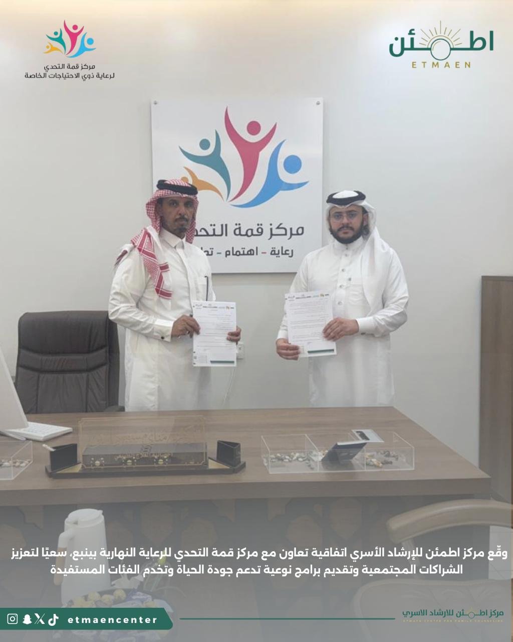 وقّعنا اتفاقية تعاون مع مركز قمة التحدي للرعاية النهارية بينبع، لفتح آفاق أوسع في تقديم خدمات نوعية تُعزز جودة الحياة وتخدم المستفيدين.